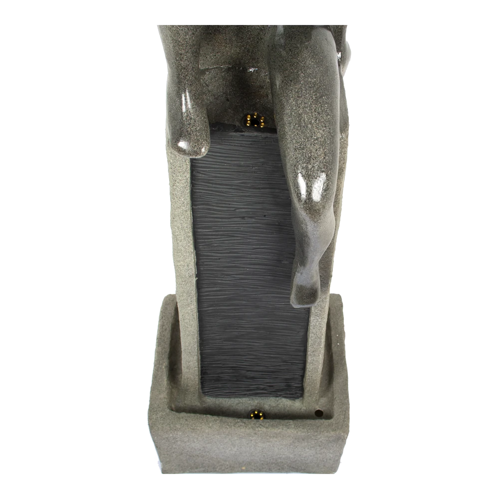 Waterornament Zagreb is een stijlvolle terrasfontein met een hoogte van 151cm. Hij is gemaakt van polystone, hard kunststof, en bestaat uit een stonelook pilaar met daarop een zittend persoon. Het beeld bovenop lijkt op hardsteen met gladde, donkergrijze afwerking. De pilaar is grijs van kleur en heeft een ruwere afwerking. In het midden van de pilaar kabbelt het water naar beneden. Daarnaast zit er zowel aan de boven- als onderzijde een 6-LED bevestigd. Hierdoor geeft het waterornament extra sfeer in de avonduren.